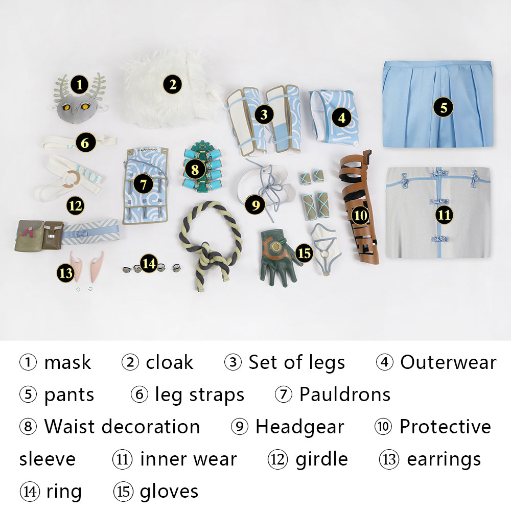 Included Items: cloak, mask, set of legs, outerwear, leg straps, pauldrons, headgear, protective, waist decoration, inner wear, girdle, earrings, pants, sleeve, ring, gloves